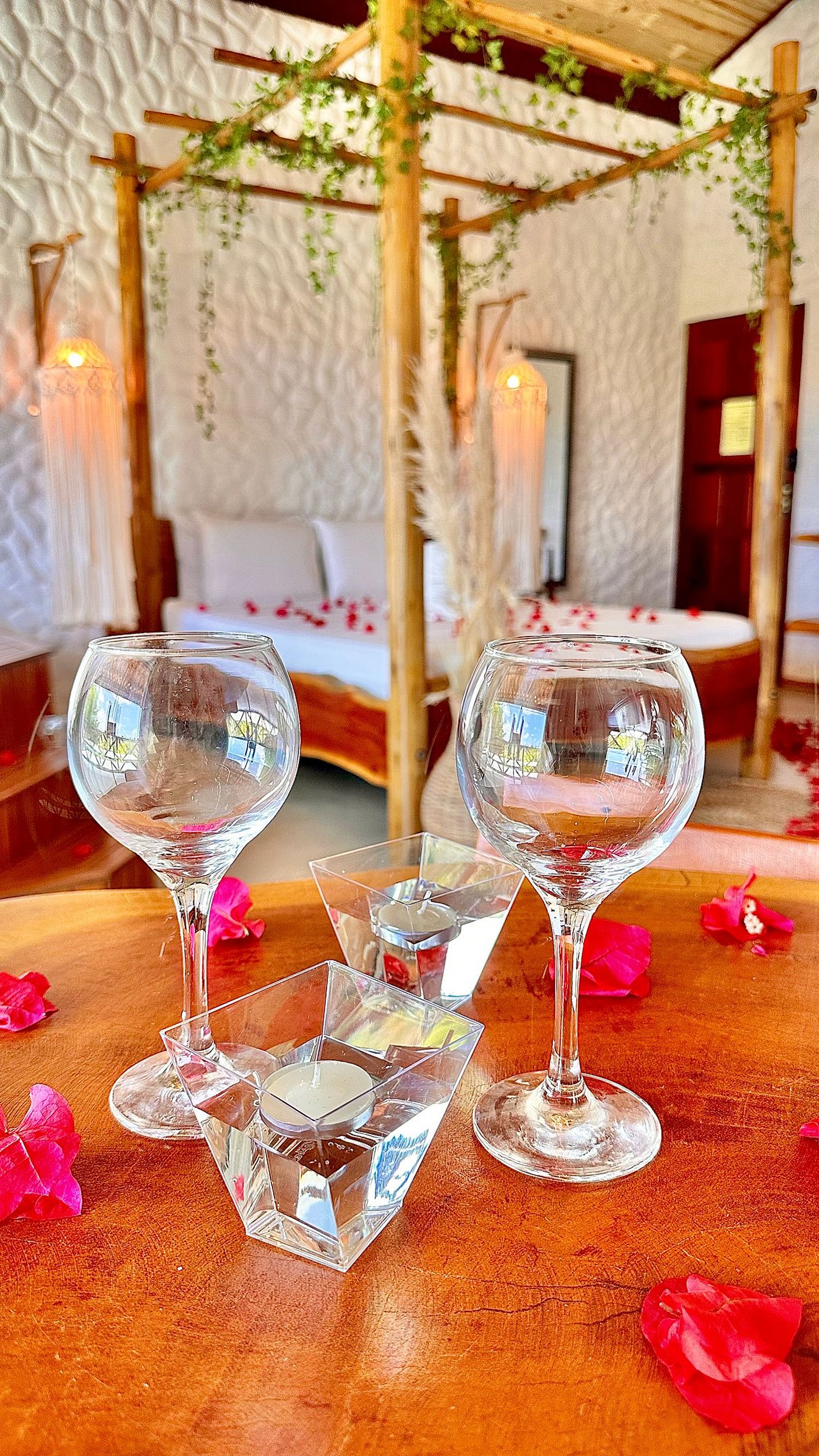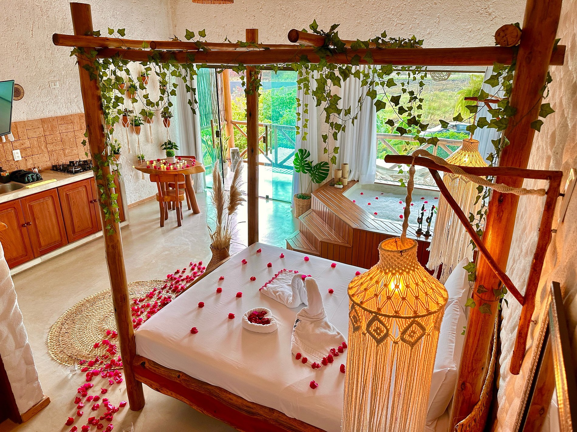 La Suite Exotic Tribos está inspirada en antiguas civilizaciones tribales, ideal para momentos de puro romance e intimidad. Cuenta con una hermosa y espaciosa tina rústica revestida en cemento quemado, climatizada, con deck de madera, hidromasaje y LED. Esta amplia Suite (47m²) cuenta con aire acondicionado, smart TV con acceso a varios canales, wifi de excelente calidad, ropa de cama y baño, colchón queen size, cocina totalmente equipada, comedor con mesa y sillas y balcón.